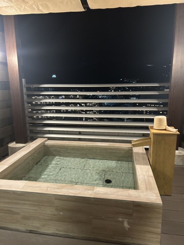 熱海と言ったら温泉!なんと、ホテルの部屋に露天風呂が!しかも、熱海城まで見えて最高の景色でした。