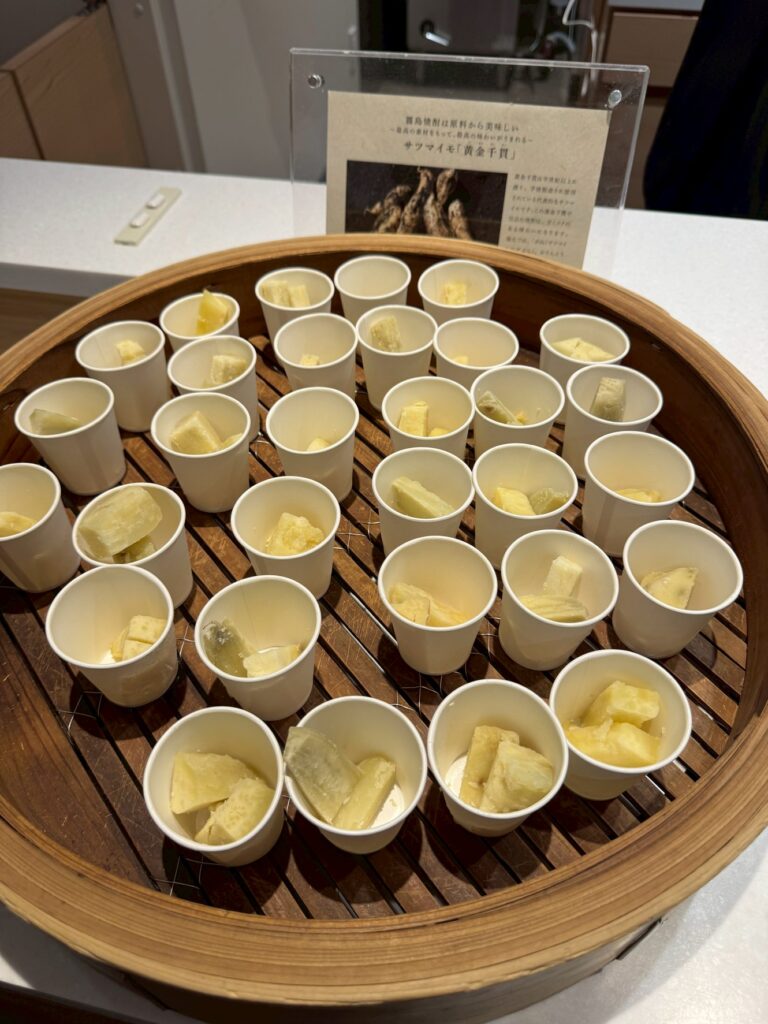 見学の最後に、原料となるサツマイモを試食。蒸した“黄金千貫”
