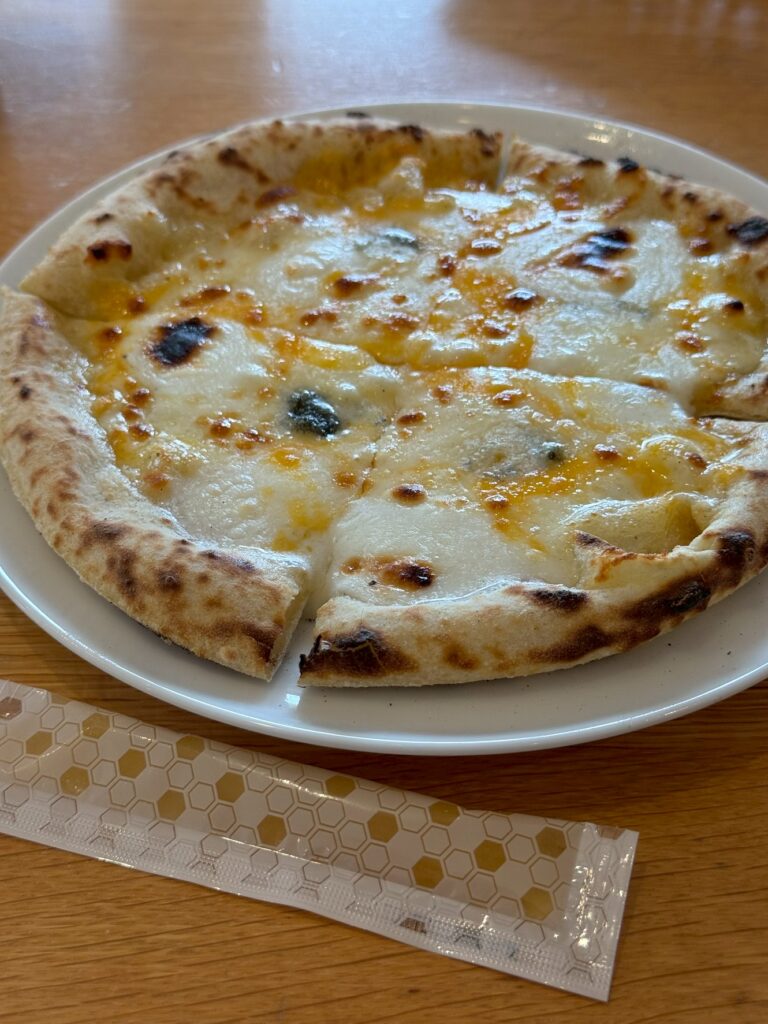 ランチには、焼酎もろみ(酒粕のようなもの)を使ったピザ。