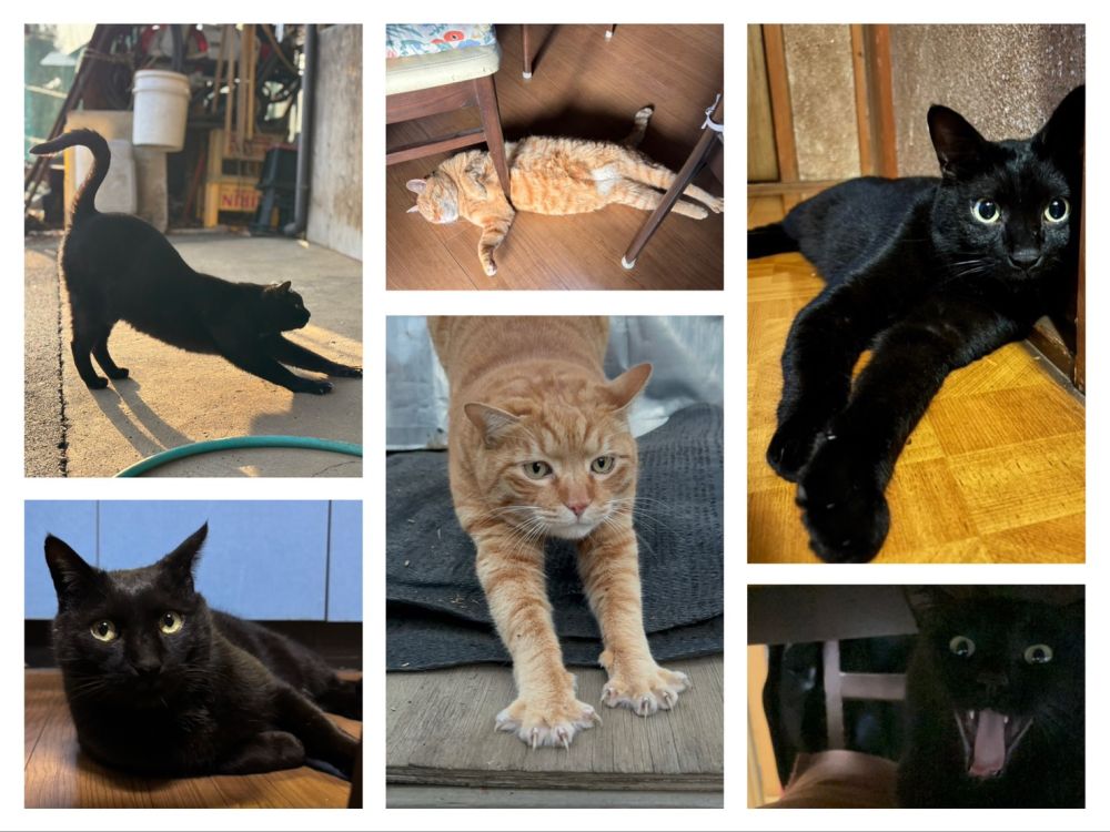 艶々の大きな黒猫と、ぽぬっとしたトラ猫、元気いっぱいの黒猫です。